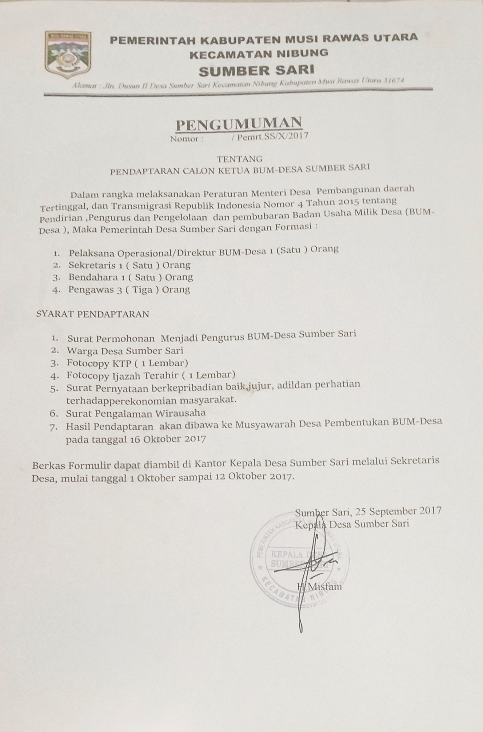 COGANEWS.CO.ID | MURATARA – Pemerintah Desa Sumber Sari membuka pendaftaran untuk Pengurus BUMDes Sumber Sari untuk Periode 2017-2028.