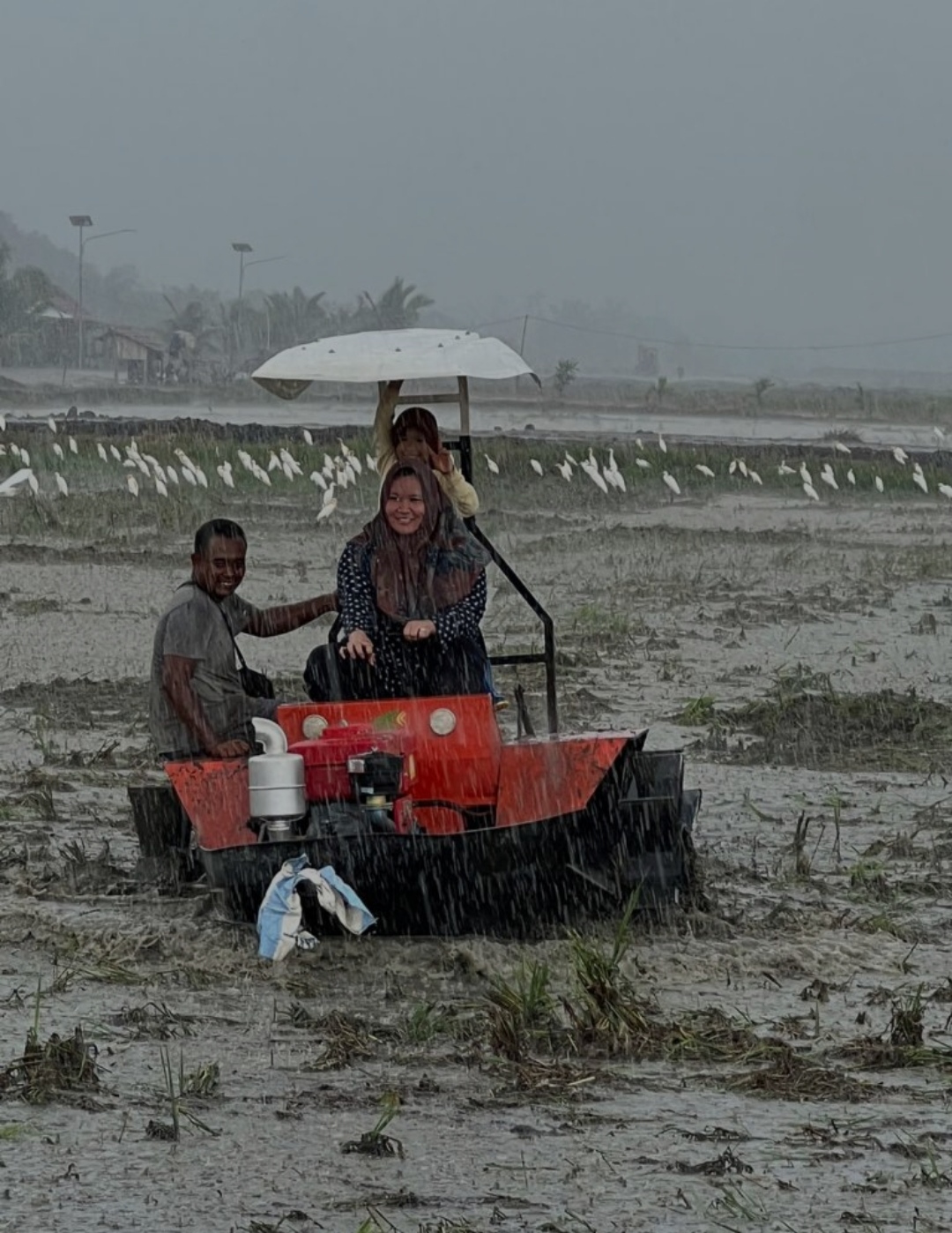 Tidak hanya Bupati, sang istri dr. Sri Fitriyanti Askolani bersama sang Putri pun tak ingin ketinggalan menjajal kecanggihan alat tersebut dalam membajak sawah, meskipun areal persawahan sedang diguyur hujan deras.