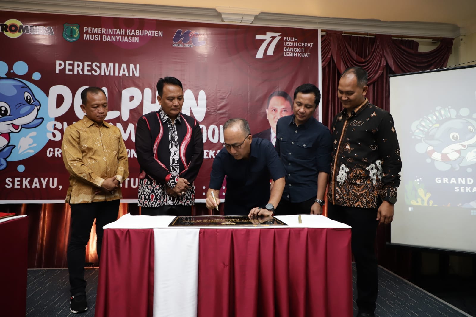 Launching Dolphin Swimming Pool Grand Ranggonang Hotel Sekayu ini ditandai dengan pemotongan tumpeng, penandatanganan prasasti, dan gunting pita oleh Pj Bupati Muba. (Yan Coga)