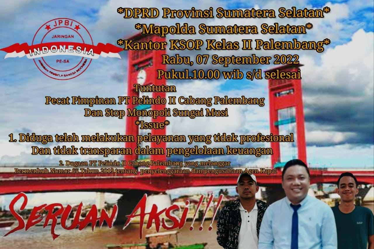 Palembang, Coganews.co.id – Aktivis Jaringan Pembela Bangsa Indonesia (JPBI) akan melakukan aksi damai pada hari Rabu tgl 7 September 2022, dengan tuntutan meminta Gubernur Sumsel dan DPRD Sumsel untuk memberikan rekomendasi kepada Kementerian BUMN memecat Pimpinan PT. Pelindo II Cabang Palembang yang diduga melakukan pelayanan tidak profesional dan tidak transparan dalam pengelolaan keuangan, serta meminta Polda Sumsel untuk segera mengusut tuntas dugaan monopoli serta indikasi telah melakukan intimidasi dan pemaksaan kepada agen pengusaha pelabuhan, yang melanggar Permenhub Nomor 64 Tahun 2019 tentang Penyelenggaraan dan Pengusahaan Agen Kapal.