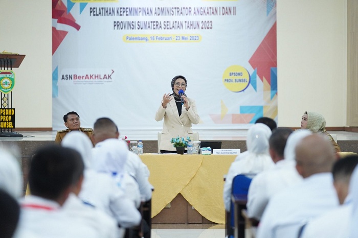 Ketua DPRD Provinsi Sumatera Selatan Hj. R.A. Anita Noeringhati, SH.,MH., memberikan materi pada kegiatan Manajemen Kinerja Aparatur Sipil Negara (ASN) dalam Pelatihan Kepemimpinan Administrator (PKA) Angkatan I dan II Provinsi Sumatera Selatan tahun 2023 yang diikuti oleh 80 orang peserta Pejabat Eselon III di Lingkungan Pemerintahan Provinsi Sumatera Selatan, Kabupaten/ Kota di Provinsi Sumatera Selatan dan terdapat juga peserta dari Provinsi Sumatera Barat, adapun kegiatan tersebut diselenggarakan di Aula Putri Kembang Dadar Kantor Badan Pengembangan Sumber Daya Manusia Daerah (BPSDMD) Provinsi Sumatera Selatan.