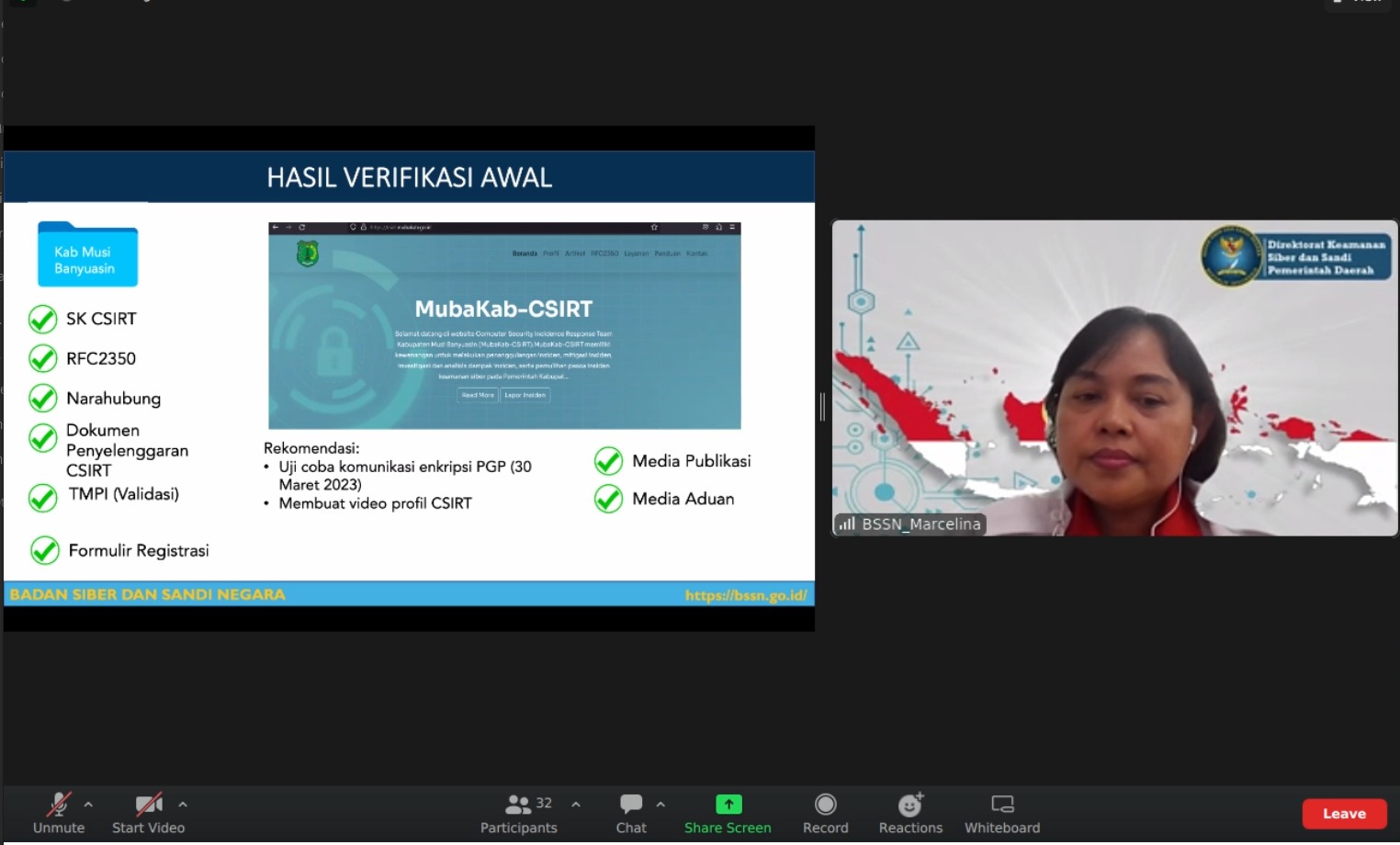 Coganews co.id | Sekayu, Pemerintah Kabupaten Musi Banyuasin melalui Dinas Komunikasi dan Informatika Kabupaten Musi Banyuasin (Dinkominfo Muba) mengikuti rapat penting yg dilaksanakan oleh Badan Siber dan Sandi Negara melalui Deputi Bidang Keamanan Siber dan Sandi Pemerintahan dan Pembangunan Manusia. Kegiatan Rapat Koordinasi Awal Persiapan Pembentukan CSIRT Kabupaten/ Kota di Provinsi Sumatera Selatan Tahun 2023, diruang virtual room Dinkominfo Muba, Selasa,28/3.