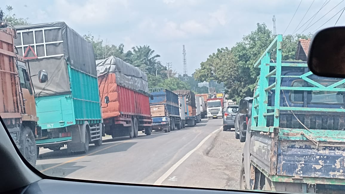 Coganews.co.id. Sekayu – Macet panjang di jalan lintas Tungkal Jaya – Sungai Lilin Kabupaten Muba yang disebabkan terjadinya insiden kecelakaan membuat kendaraan yang melintas banyak terhenti, Senin (26/6/2023).
