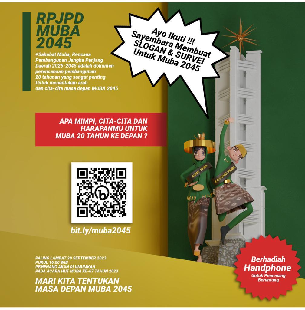 “Jadi di sayembara ini peserta dapat mengungkapkan harapan dan cita-citanya untuk kemajuan daerah kabupaten Muba. Jadi, peserta dalam Sayembara membuat slogan & survei untuk MUBA 2045, untuk persyaratannya Klik bit.ly/muba2045, sayembara ini Paling Lambat 20 September 2023 pukul 16.00 WIB. Bagi pemenang yang beruntung akan mendapatkan satu unit Handphone. Ayo buruan Ikuti dan dapatkan hadiahnya,”tandasnya.
