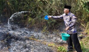 Tak pelak, mantan Kades Pematang Palas tersebut yang masih memakai batik turun dari kendaraan dengan membawa air seadanya untuk memadamkan api.