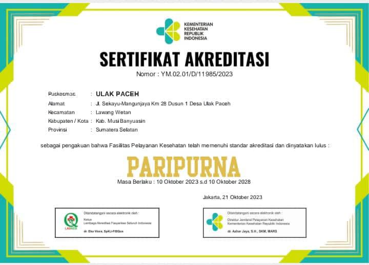 Coganews.co.id | MUBA – Unit Pelaksana Teknis (UPT) Puskesmas Ulak Paceh mendapatkan Akreditasi Tingkat Paripurna dari Kementerian Kesehatan Republik Indonesia (Kemenkes RI). Akreditasi ini berlaku mulai 10 Oktober 2023 hingga 10 Oktober 2028.