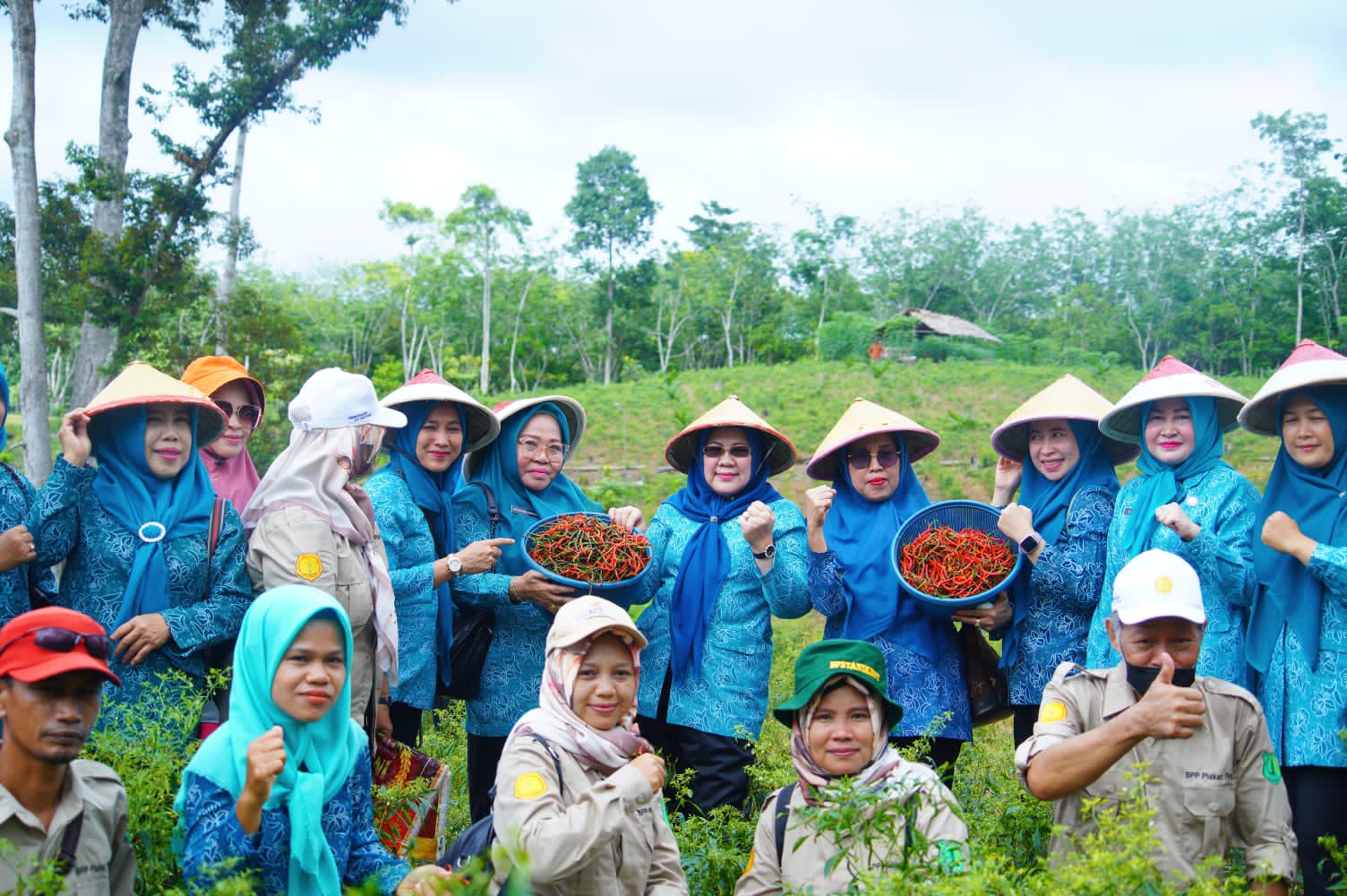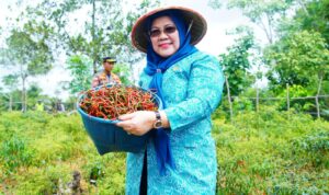 MUBA – Penjabat (Pj) Ketua Tim Penggerak PKK Kabupaten Musi Banyuasin (Muba) Hj Asna Aini Apriyadi dan pengurus TP PKK Kabupaten Muba bersama Kepala Dinas Tanaman Pangan dan Holtikultura Kabupaten Muba Ir H Thamrin, melakukan panen cabai merah di Desa Bukit Indah (B3) Kecamatan Palakat Tinggi Kabupaten Muba.