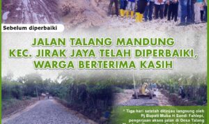 “Alhamdulillah pengerjaan akses jalan di Desa Talang Mandung Kecamatan Jirak Jaya telah rampung diperbaiki dan sudah bisa beraktivitas seperti sediakala. Terima kasih reaksi cepat Pemkab Muba khususnya pak Pj Bupati Muba H Sandi Fahlepi beserta OPD terkait yang sudah bekerja dengan maksimal menyelesaikan perbaikan jalan ini,”tandasnya.