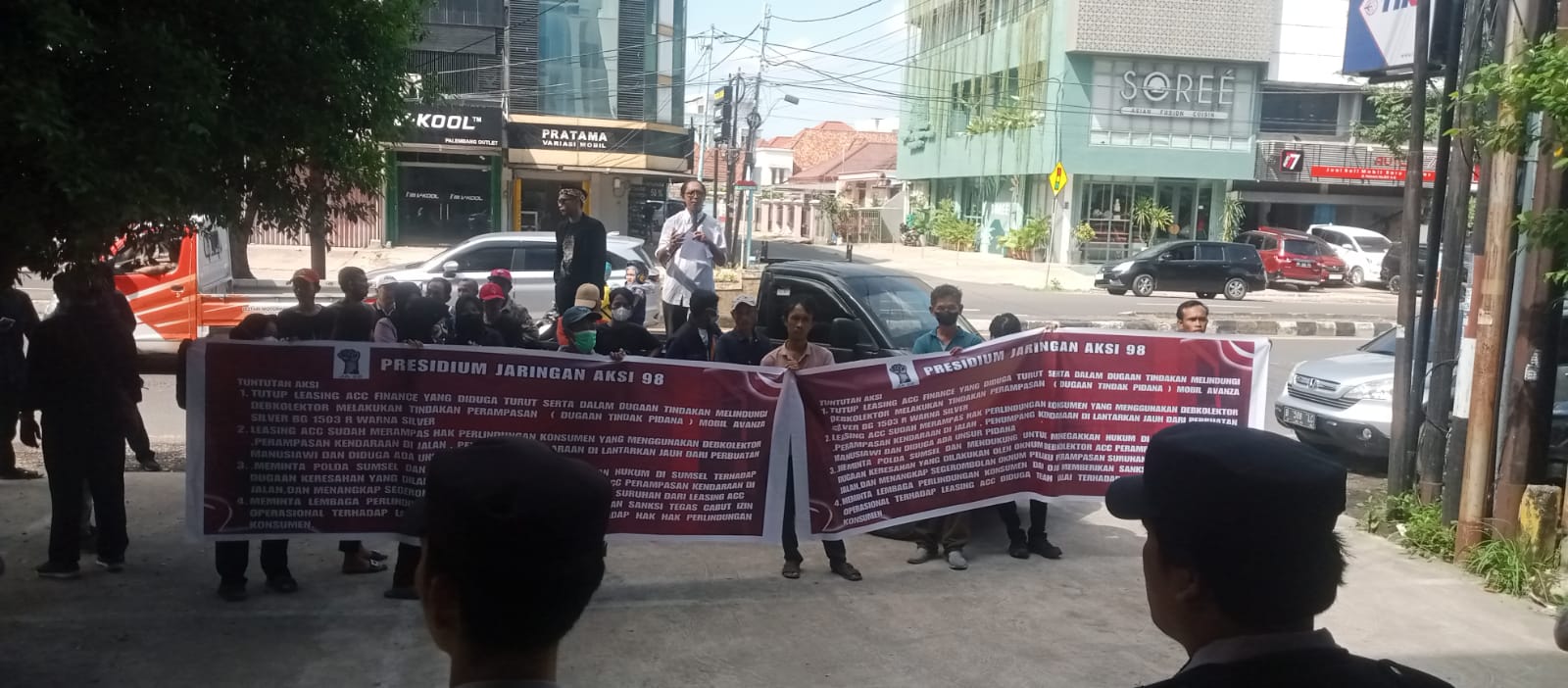 Koordinator Aksi Ramogers, SH, Muhammad Ali, SE, M.Si, Bambang Purnomo, Mukri, Supratman Suryadi, Irawan Van Maryyi (ambon), Junaidi, Rizki Pratama ST mengatakan, “Presidium jaringan aksi “98” Sumatera Selatan melakukan aksi solidaritas untuk melindungi hak konsumen, setelah memperhatikan secara seksama apa yang dilakukan leasing ACC telah mengangkangi peraturan kapolri (perkap) No 8 tahun 2011 tentang pengamanan eksekusi jaminan fidusia,” katanya.