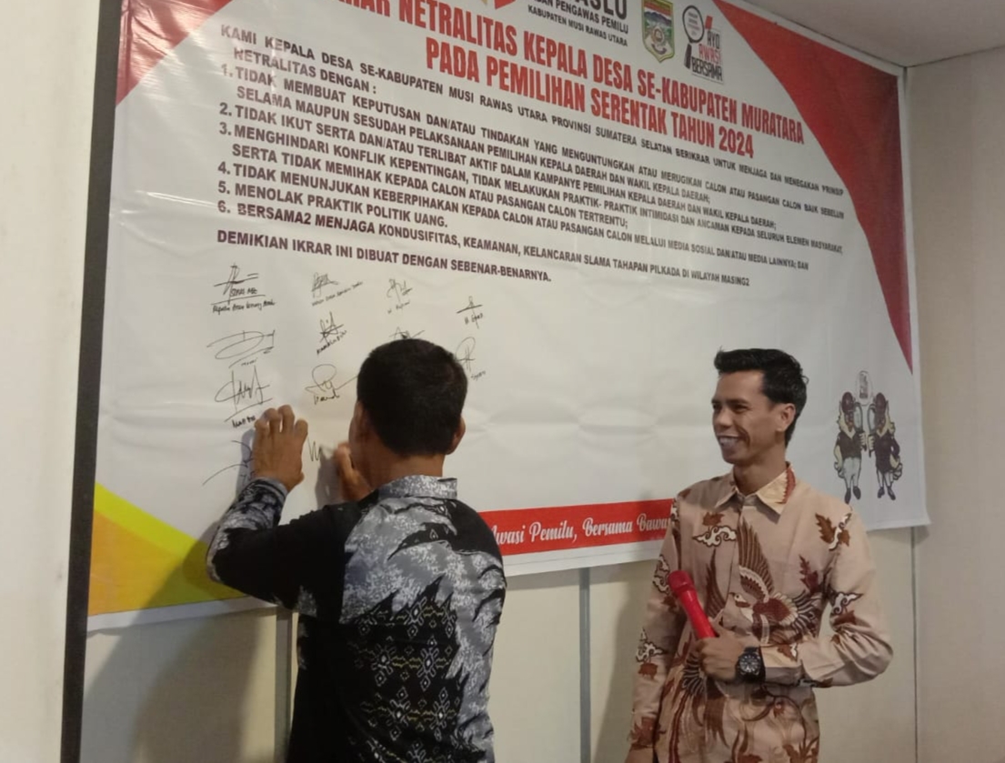 COGANEWS.co.id | LUBUK LINGGAU – Kegiatan Badan Pengawas Pemilihan Umum (Bawaslu) Kabupaten Musi Rawas Utara (Muratara), gelar kegiatan agar Kepala Desa (Kades) dan Perangkat Desa , Badan Permusyawaratan Desa (BPD) untuk selalu menjaga Netralitas dalam Pemilihan Kepala Daerah (Pilkada) serentak tahun 2024 pada Pemilihan Gubernur-Wakil Gubernur, Pemilihan Bupati-Wakil Bupati.