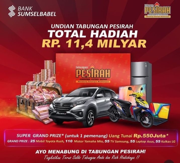 Total hadiah senilai Rp 11,4 MILYAR siap dibagikan untuk para nasabah setia Bank Sumsel Babel !!