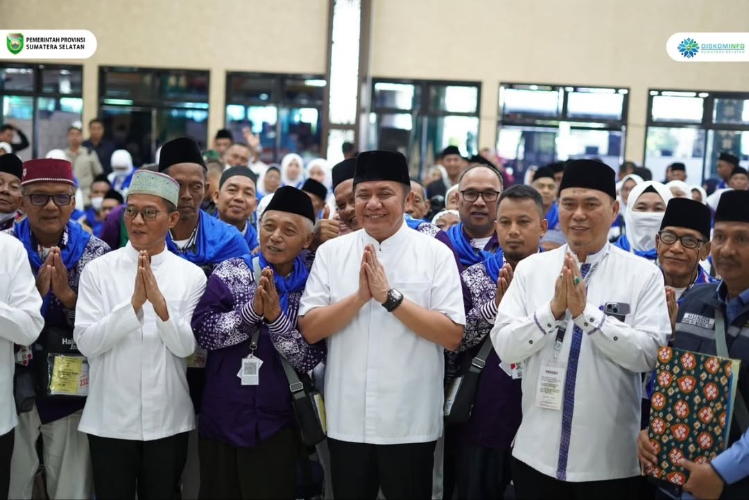 Palembang. Gubernur Sumatera Selatan, H. Herman Deru (HD) melepas keberangkatan jamaah haji tahun 1446H / 2025M kloter pertama Embarkasi Palembang di Asrama Haji Palembang (Sabtu, 3/5/2025).