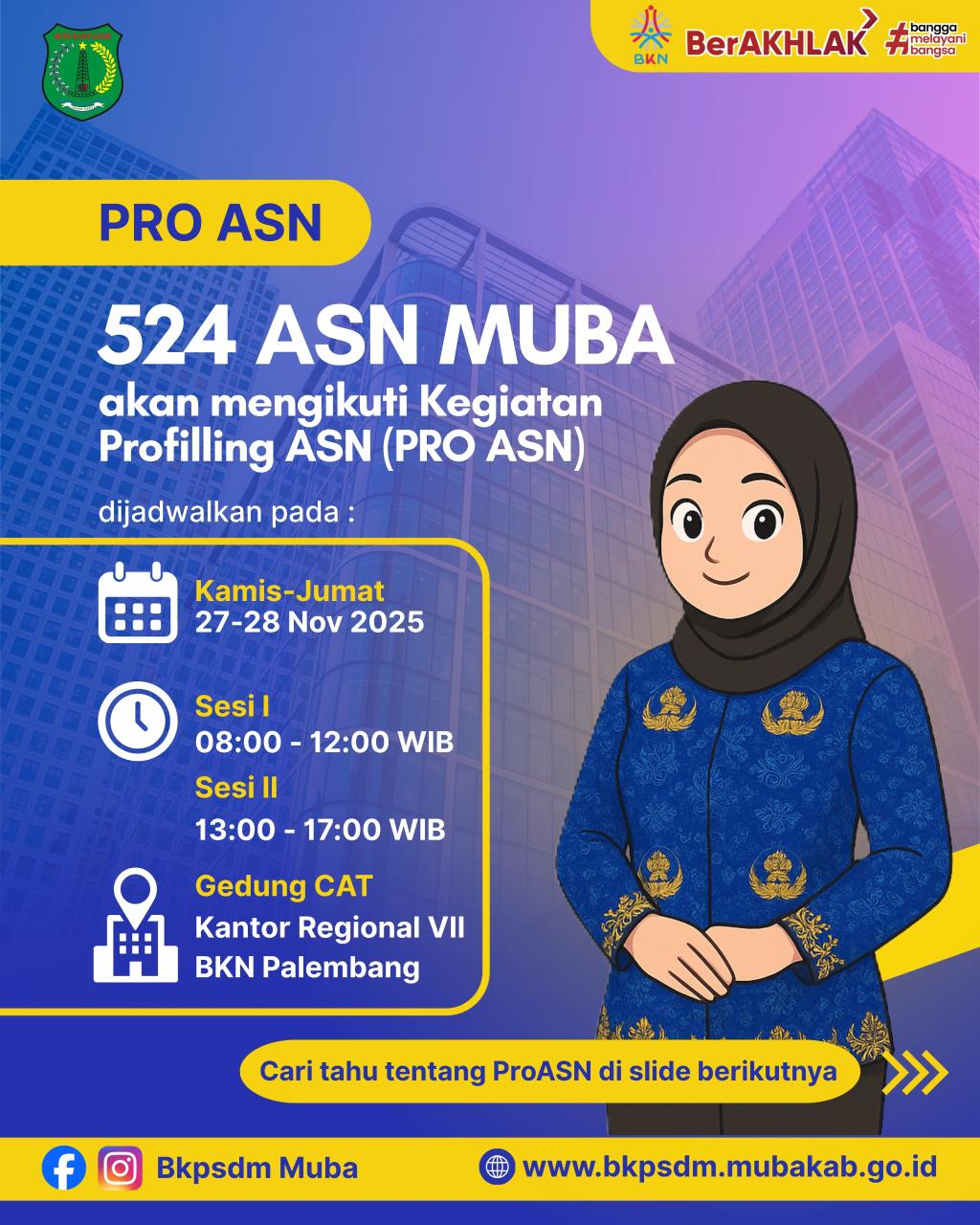 Coganews.co.id | SEKAYU – Sebanyak 524 Aparatur Sipil Negara (ASN) di lingkungan Pemerintah Kabupaten Musi Banyuasin dijadwalkan mengikuti Kegiatan Profiling ASN (Pro ASN) pada 27–28 November 2025 di Gedung CAT Kantor Regional VII BKN Palembang. Pelaksanaan dibagi menjadi dua sesi setiap hari, yakni Sesi I pukul 08.00–12.00 WIB dan Sesi II pukul 13.00–17.00 WIB.